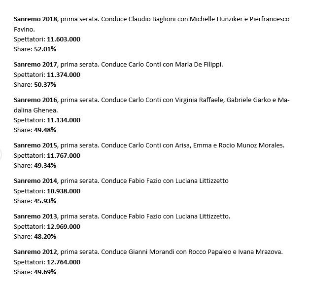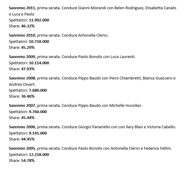Si sa, il ‘Festival di Sanremo’ oltre ad essere un evento mediatico, è anche una corsa all’ultimo telespettatore. Si riusciranno a superare i dati dell’anno precedente? Ci sarà un boom? o sarà un flop? Insomma, sempre le stesse domande, ma del resto il gradimento del pubblico oltre a segnare il livello di qualità del prodotto, definisce anche lo stato generale del paese; infatti molti dicono che è lo specchio della società e della contemporaneità.