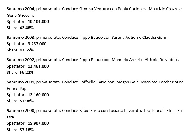 Peraltro bisogna evidenziare che rispetto al dato di 14 anni fa, oltre ad essere cambiato il sistema di conteggio degli ascolti, è cambiata anche la platea televisiva totale, che dopo il passaggio al Digitale Terrestre, si trova a scegliere tra una selva di canali che qualche anno fa non esistevano nel panorama generale. Abbiamo elencato quindi, tutti i risultati delle prime serate dal 2000 ad oggi: scopriamoli insieme.
