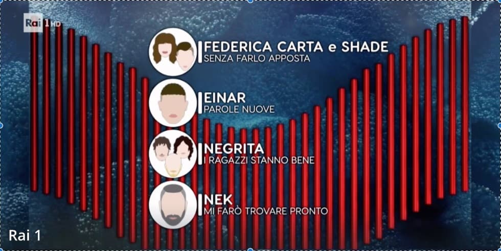 Sul fronte della gara dobbiamo segnalare i risultati che più sbigottiscono dalle votazioni della Sala Stampa. Da evidenziare Il Volo e Paola Turci nella zona gialla mentre cascano nella zona rossa Nek e Federica Carta con Shade.