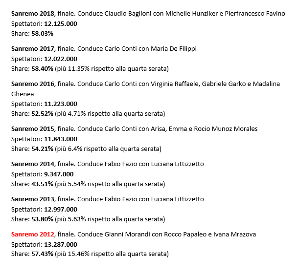 E’ ovvio che non è possibile confrontare i dati di dieci anni fa con quelli che si registreranno stasera per via del profondo cambiamento della televisione nell’ultimo periodo, ma è comunque interessante scartabellare le carte e scoprire i record. Già più fattibile sarebbe citare gli ascolti dello scorso anno: nell’edizione 2018 Baglioni nella finale raccoglie davanti alle tv 12’125’000 spettatori e uno share pari al 58,30%. Aumentano gli spettatori ma diminuisce di un soffio lo share rispetto al ‘Sanremo 2017’ firmato Conti-De Filippi (12’022’000 telespettatori e 58,40%).