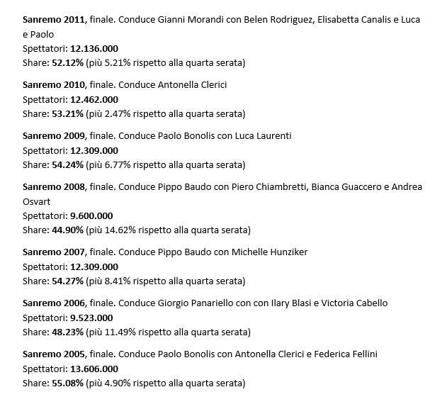 Altri tempi invece quelli in cui le serate del festival erano solo quattro. Il record positivo come finale più vista di sempre, è infatti quella del 1987, quando Pippo Baudo riuscì a tastare per la prima volta il braccio della kermesse; i telespettatori di fronte al tubo catodico erano addirittura 18’300’00 e lo share raggiunse il 77.50%. Numeri incredibili per i tempi di oggi.