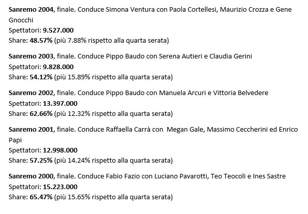 Non c’è stato nessun boom, ma questo era previsto, dato che in linea di massima chi conduce per due volte di seguito il ‘Festival di Sanremo’, fa difficoltà a battere il risultato ottenuto l’anno precedente, fatto sta che Claudio Baglioni è riuscito nell’impresa di mantenere gli ascolti di quest’anno al di sopra delle aspettative. E’ vero, i conti si fanno alla fine ma comunque è interessante scoprire gli ascolti di tutte le serate finali della manifestazioni degli ultimi anni, dal 2000 ad oggi: