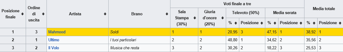 E’ un pò il sunto delle due polemiche precedenti. Mai come quest’anno la discrepanza dei voti ricevuti da casa e il voto della ‘Sala Stampa’ e della ‘Giuria degli Esperti’ è stata così netta. La corsa finale a tre è stata così ripartita: